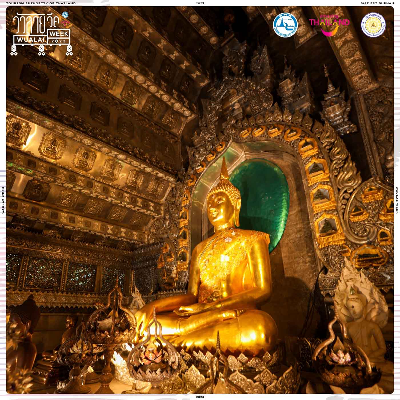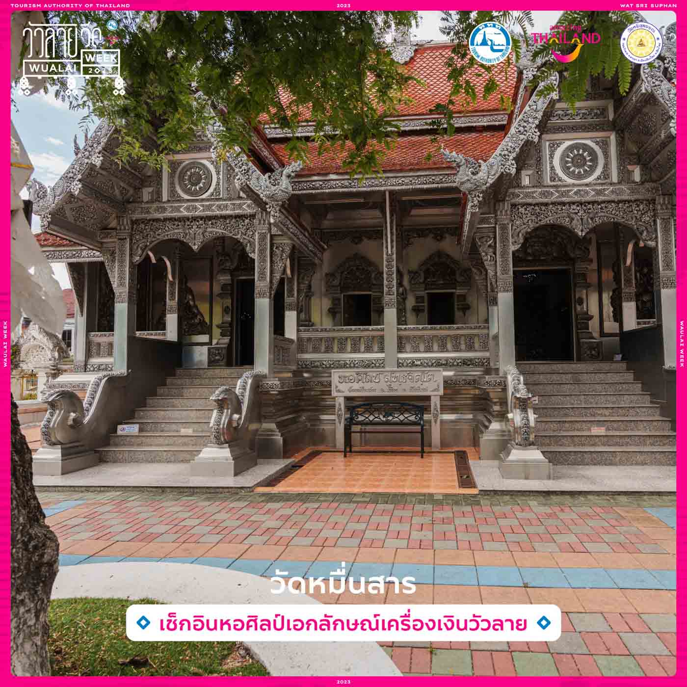 เริ่มต้นจาก “วัดศรีสุพรรณ” วัดกลางชุมชนแห่งย่านวัวลาย แลนด์มาร์กแห่งธรรมะมีความโดดเด่นอยู่ที่ “อุโบสถเงินแห่งแรกของโลก” และเป็นอันซีนเมืองไทย ทุกตารางนิ้วในโบสถ์แห่งนี้ล้วนซ่อนปริศนาธรรมจากลวดลายอันอ่อนช้อย และยังบอกเล่าถึงวิถีชุมชนเครื่องเงินอายุกว่า 200 ปี มรดกที่เปี่ยมไปด้วยฝีมือทางเชิงช่าง และความผูกพันของผู้คนที่ไม่เคยจางหาย